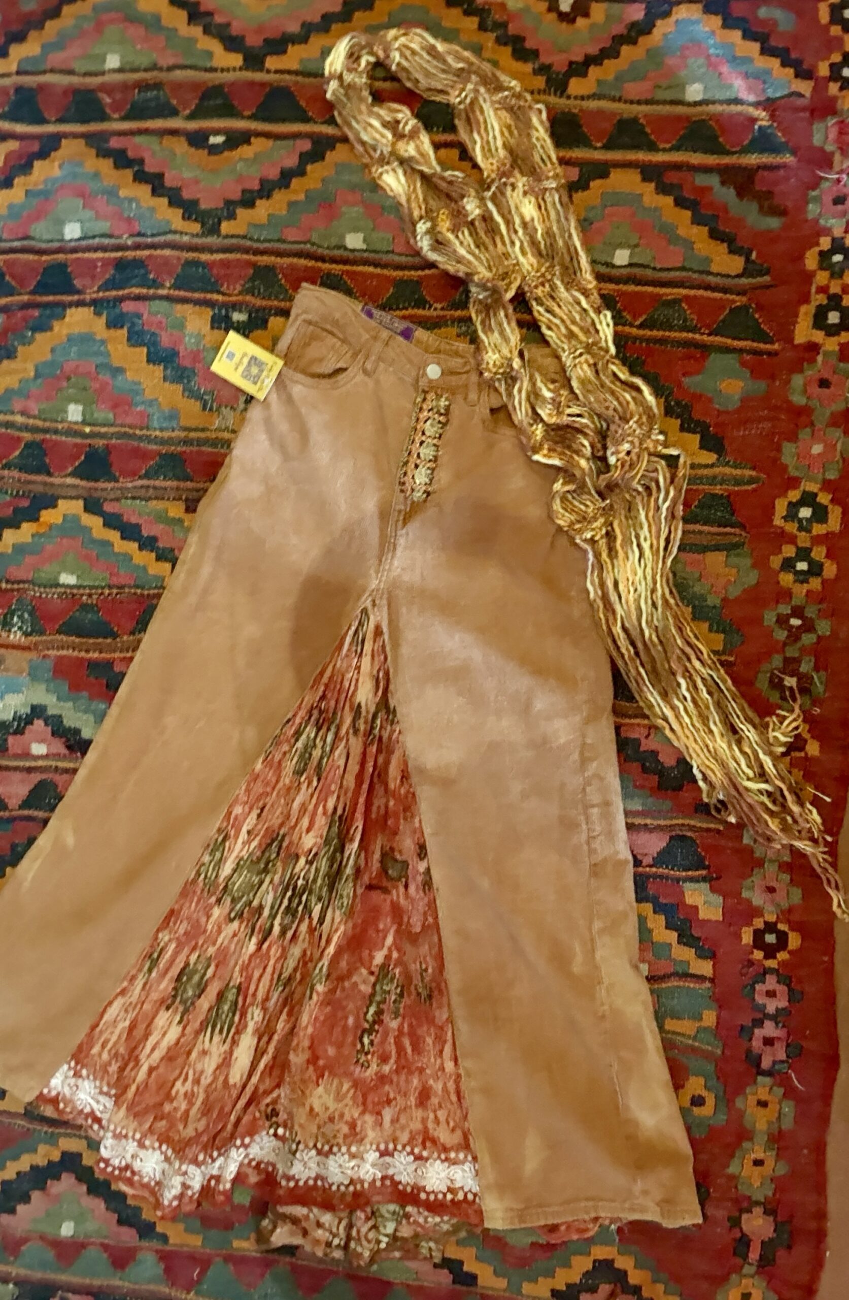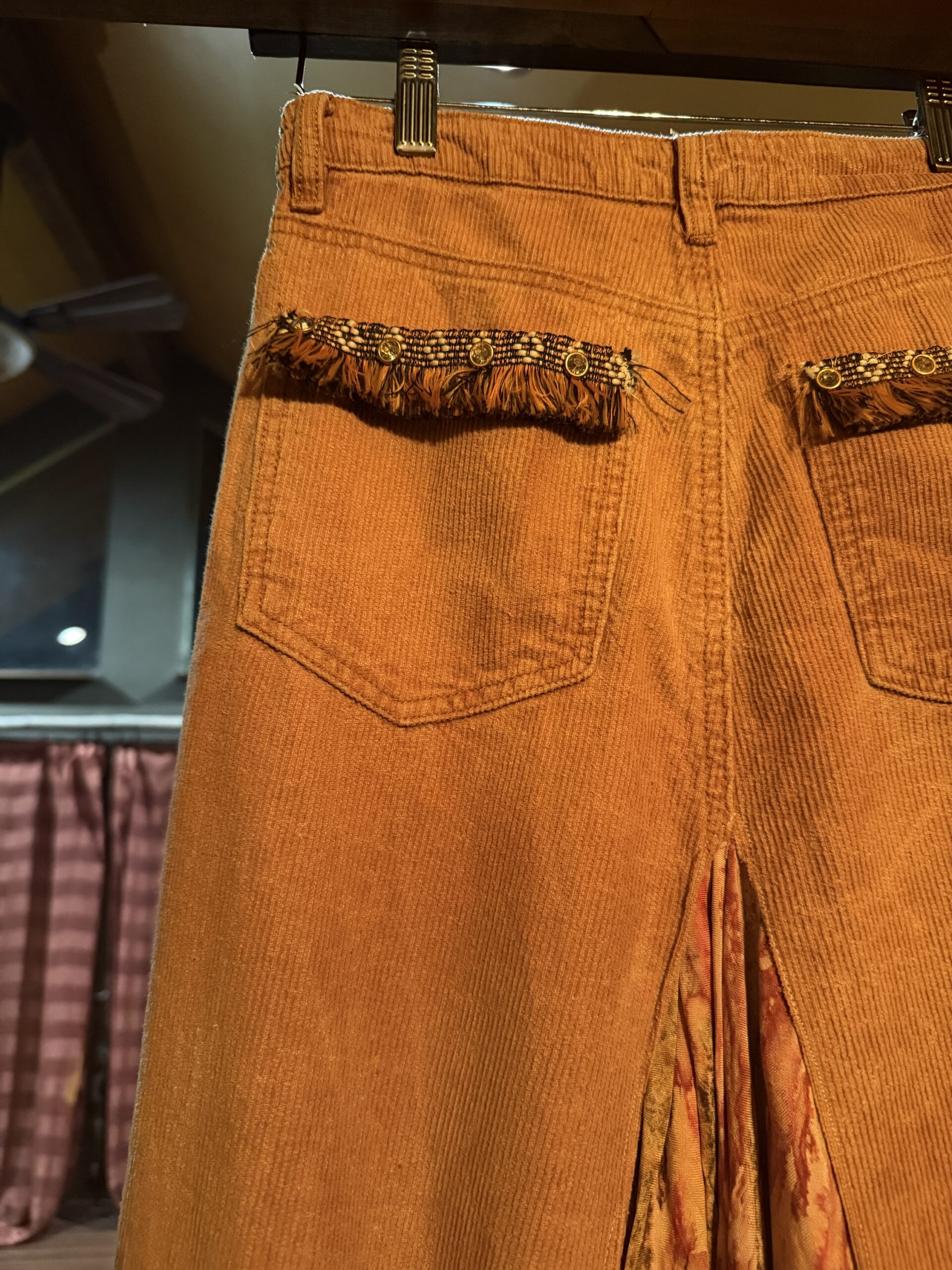 This one of a kind FunkyHippyChicBoutique  skirt is made using a sizes S SHEIN Jean and delicious  rust, and olive batik tie dye fabric (55% viscose and. 45% cotton – India) . The high waist measures approx 27 inches. These are one of a kind, this size only.
