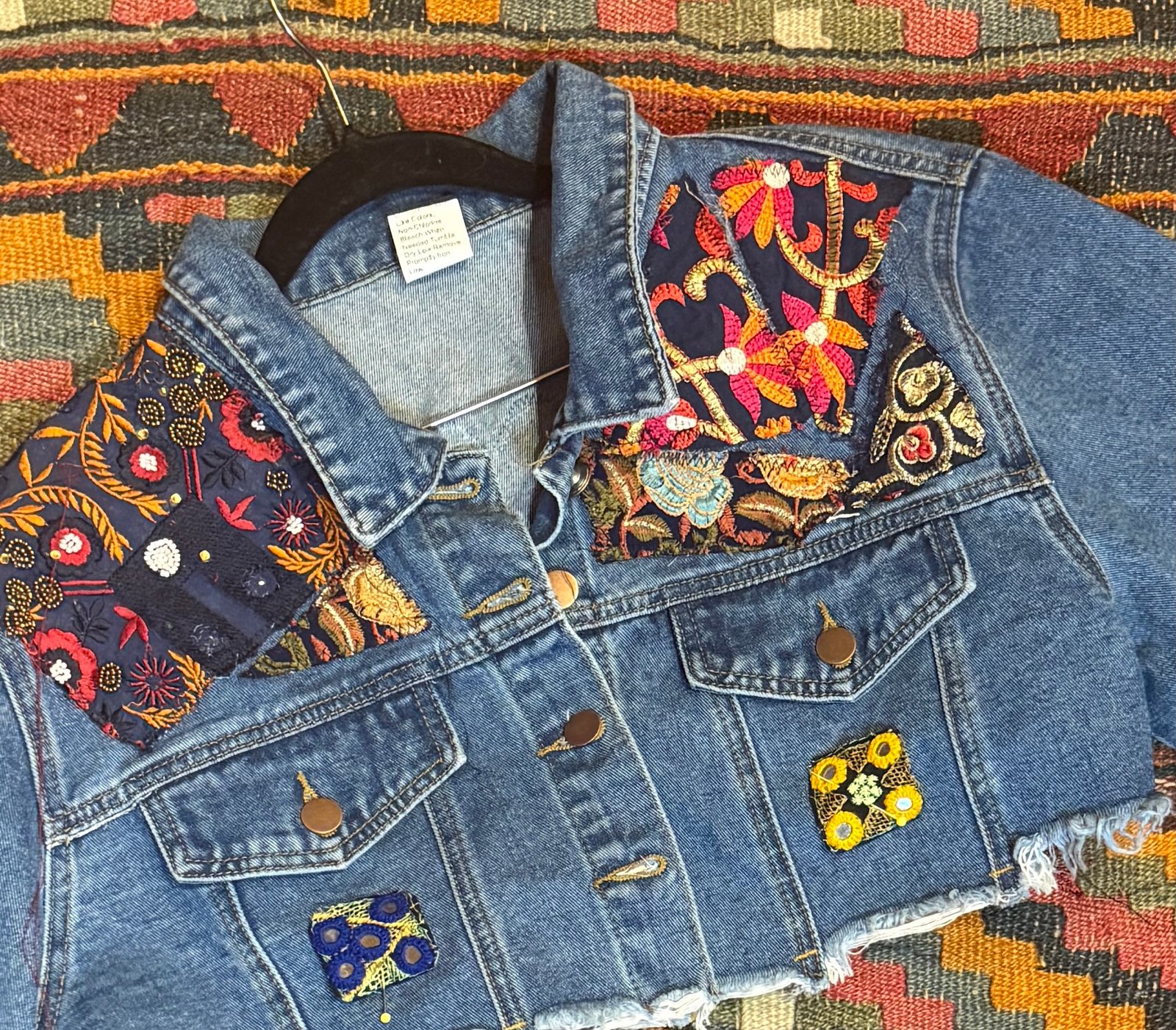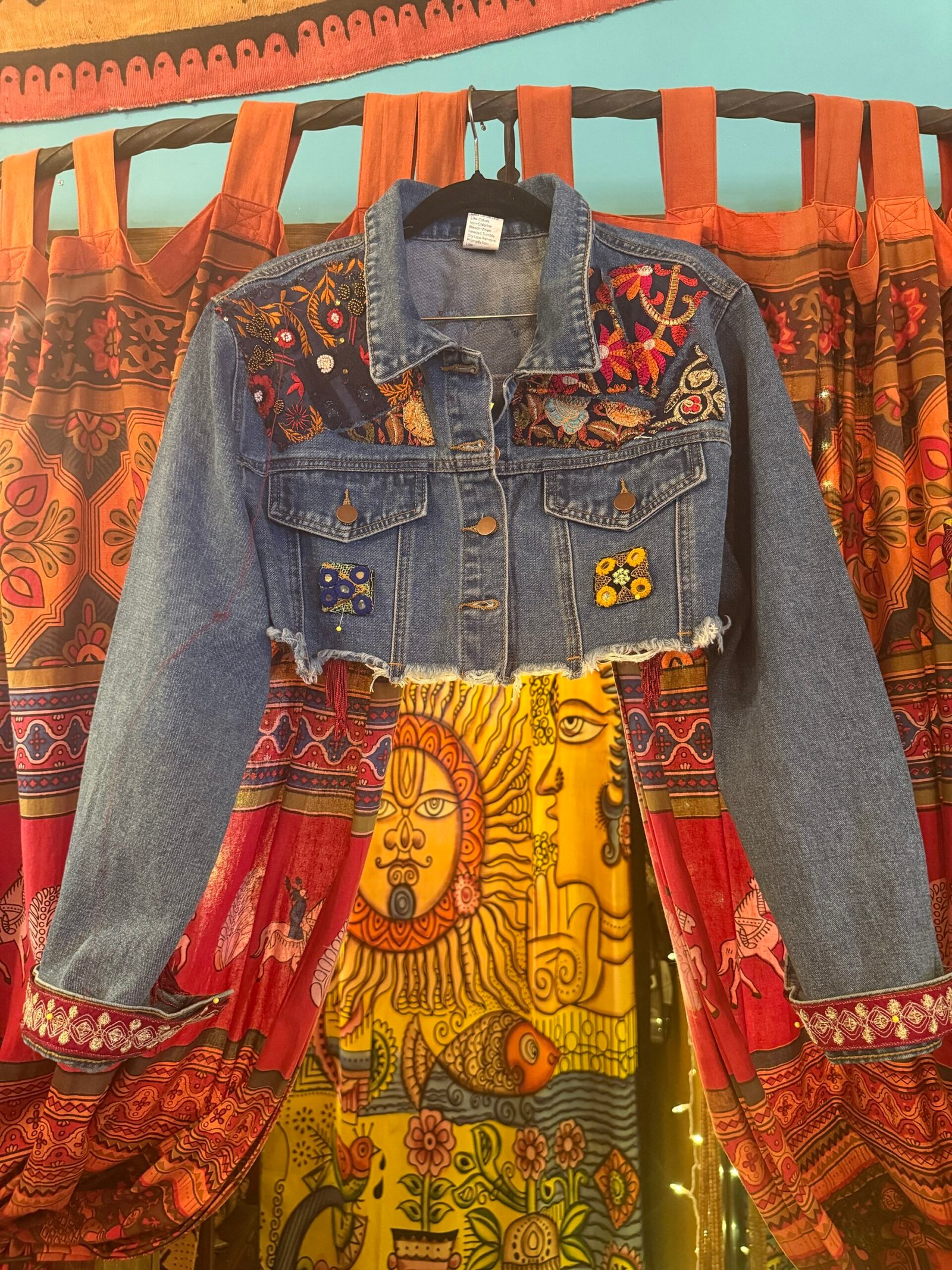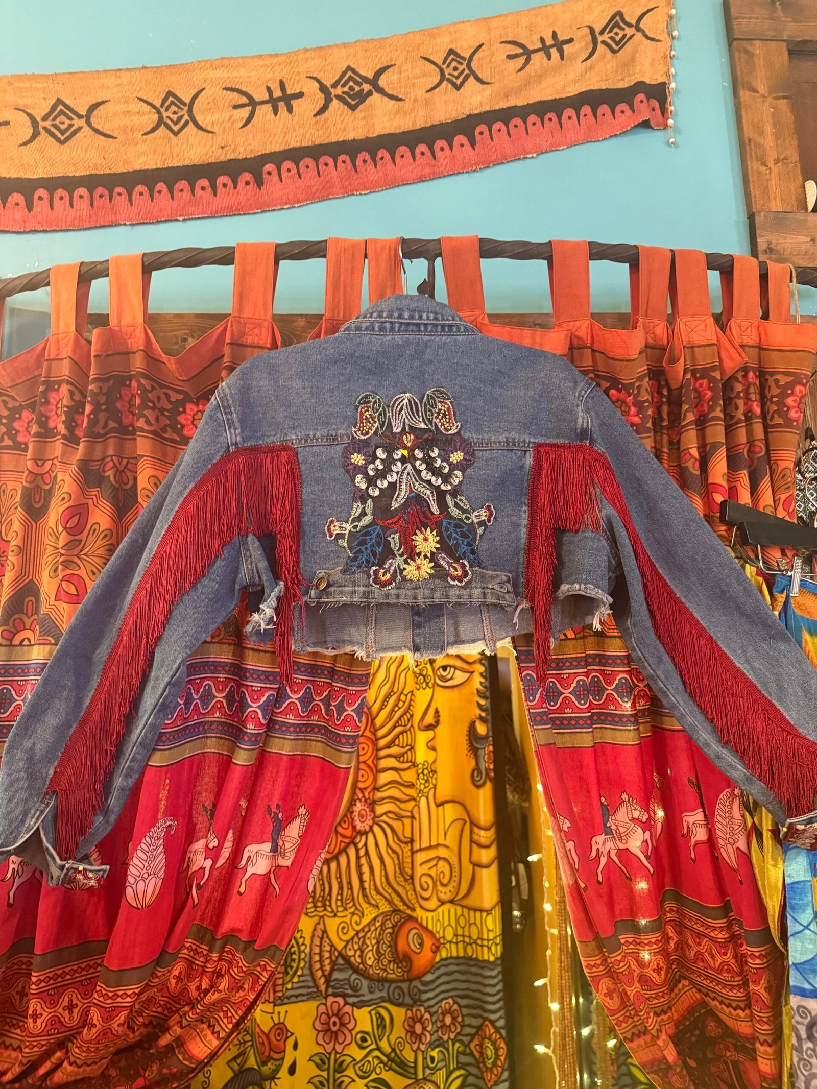 This Upcycled denim jacket is made with high quality fringe and Indian embellished patches and fabrics. This is a one of a find original FunkyHippyChicBoutique design… if this speaks to you, do not wait! Grab it!