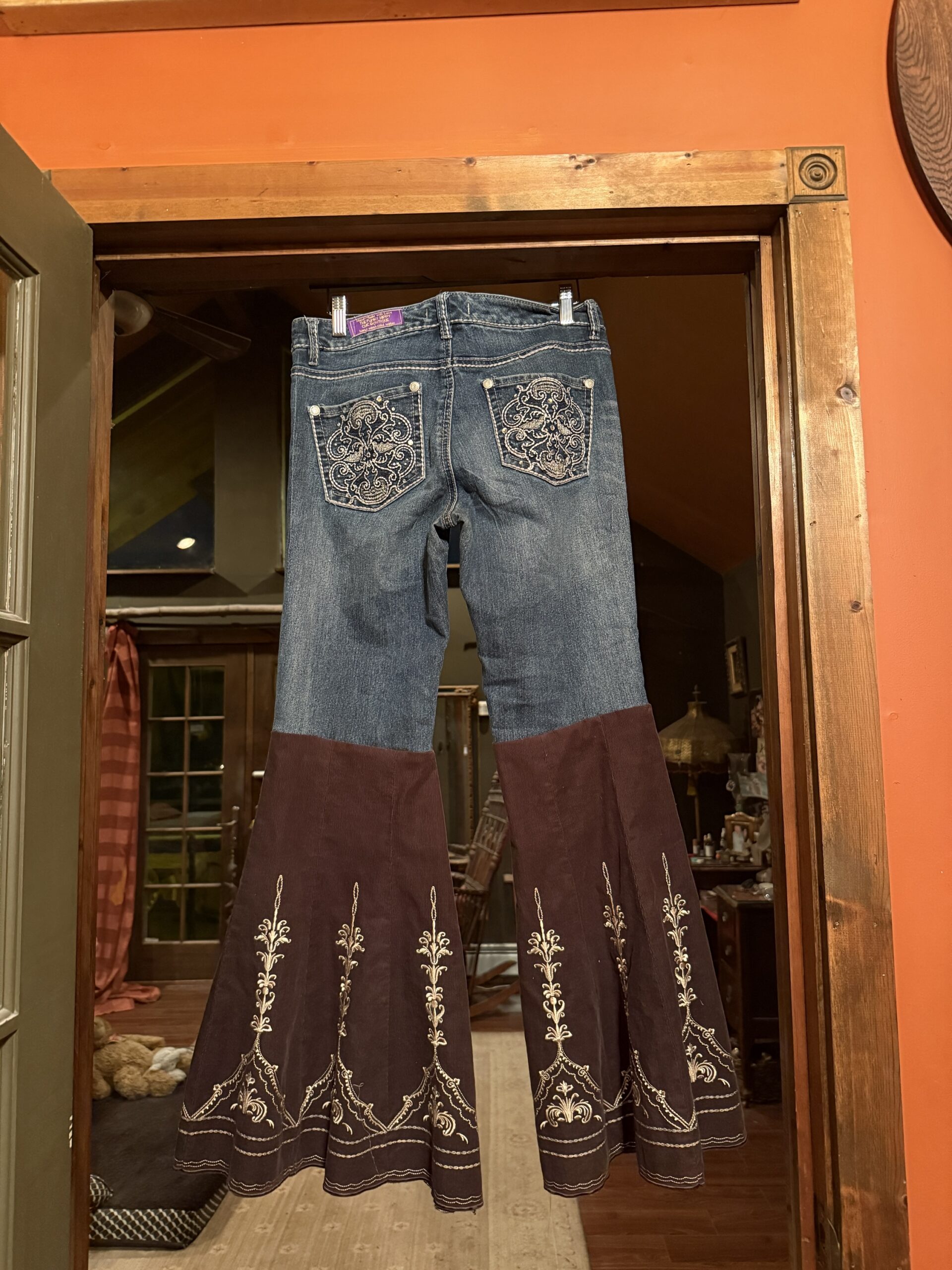 These custom made FunkyHippyChicBoutique groovy jeans were made using Nine West Vintage America jeans . Appoox 29-30 inch inseam and the mid rise jean waist measures 28″ (31 with stretch. These are one of a kind and the only size available.