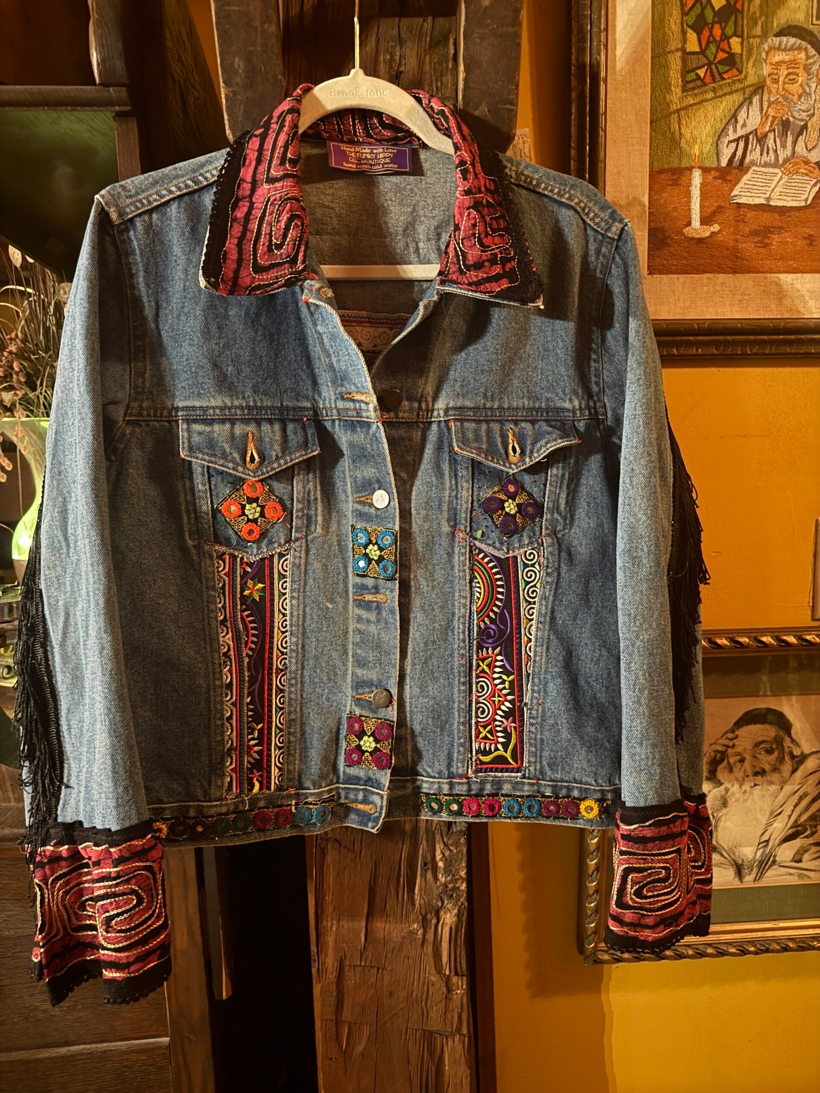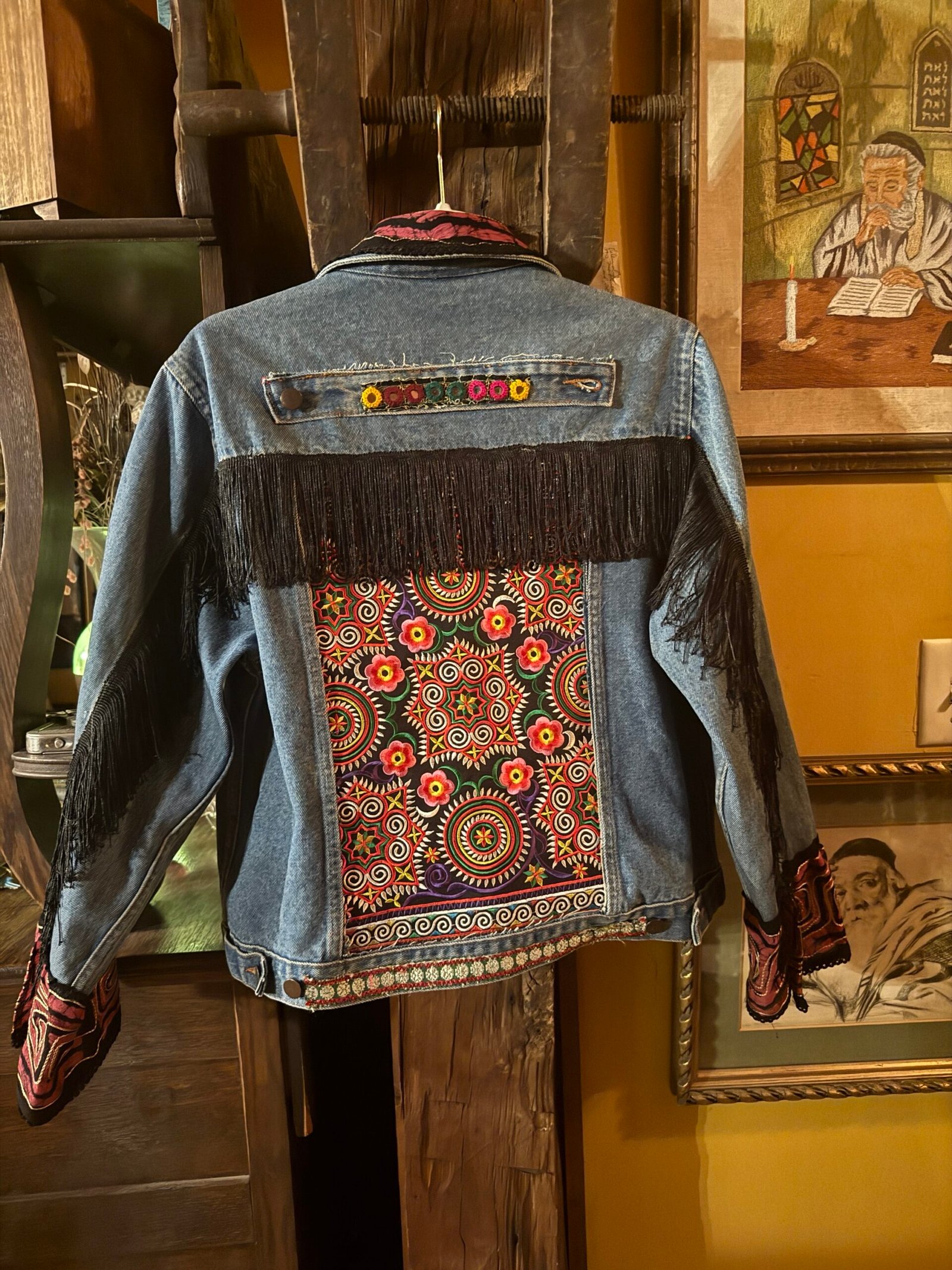 This upcycled denim jacket measures 17 inches at the shoulders, hits at the hip bones for a very flattering look. One of a kind original design by the FunkyHippyChicBoutique