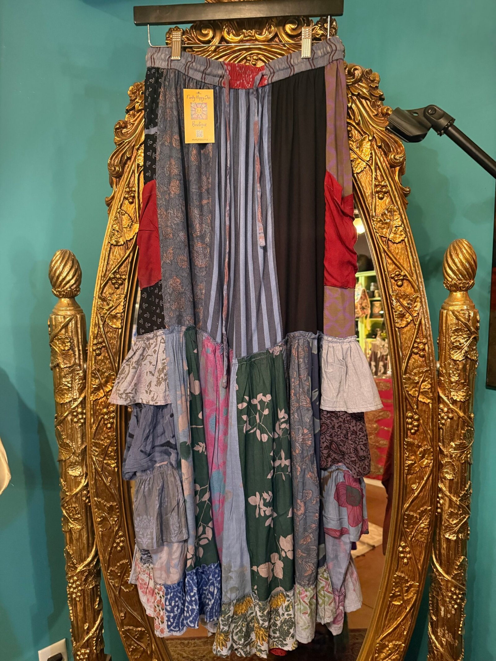 These delightful wide let ruffle palazzos have fabulous side pockets and an elastic waist. Pure comfort! Rayon made in India